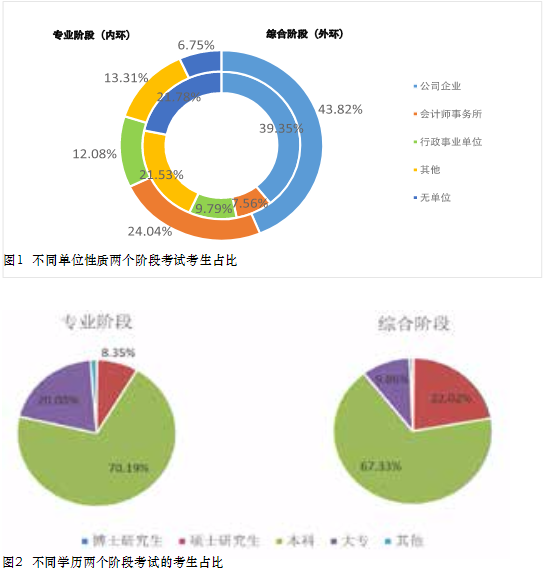 图1,表明公司企业的考生相比其他单位的考生,比例明显更高,参加两个阶段考试的报名人数占比均达到40%左右;