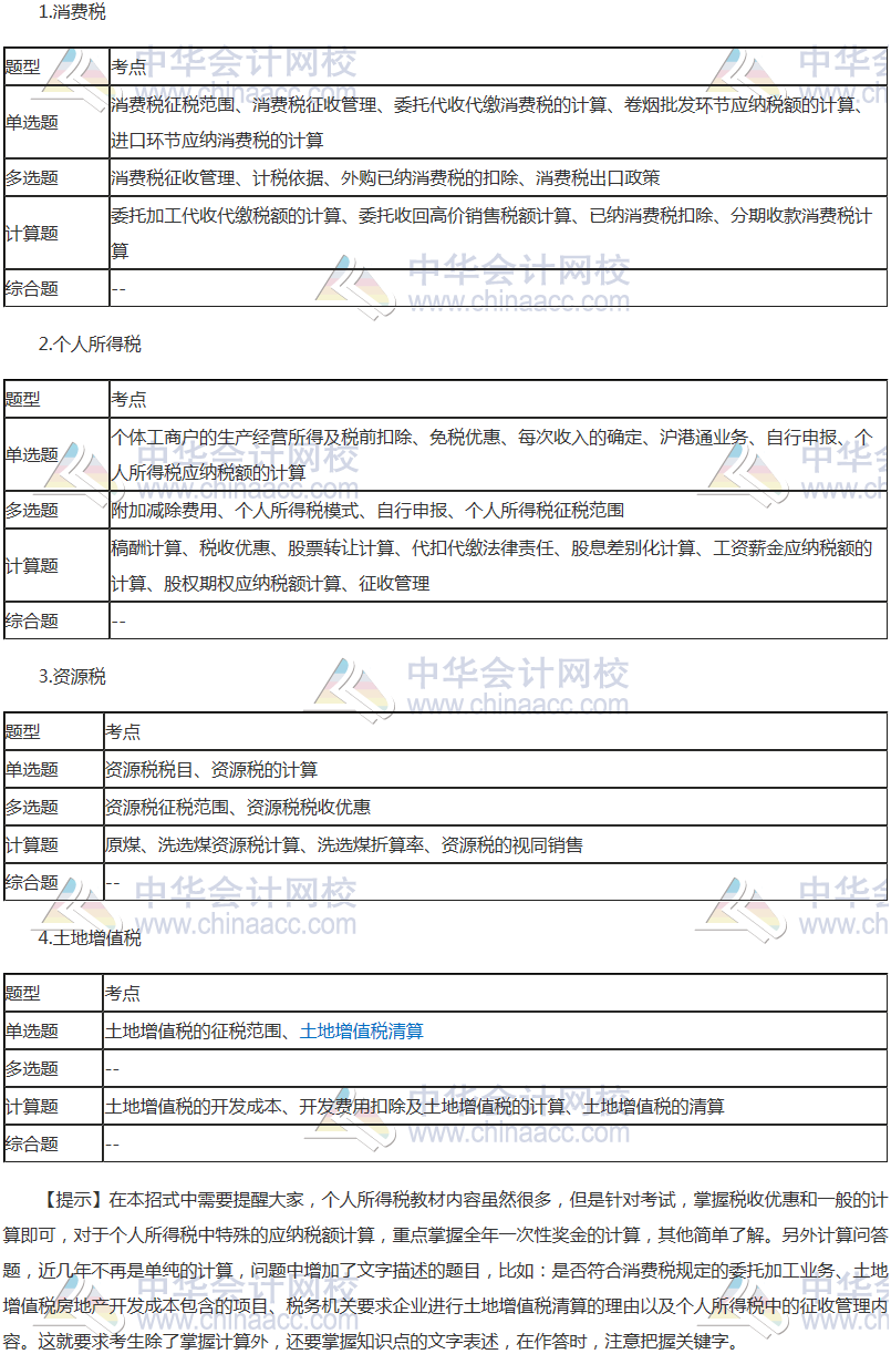 这里为什么说是“独孤四剑”呢?这“四剑”指的是消费税、个人所得税、资源税和土地增值税。这四个税种,除了客观题会考查外,考试基本每年都有计算问答题。我们先来看一下近几年这四个税种考查的知识点。