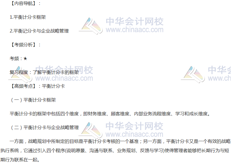 备考时间紧张,抓紧时间抓住重点备考注册会计师吧!正保会计网校教学老师为广大考生整理了高频考点,我们一起来学习2018年《财务成本管理》高频考点:平衡计分卡。本考点属于《财务成本管理》第二十章业绩评价第四节平衡计分卡的内容。