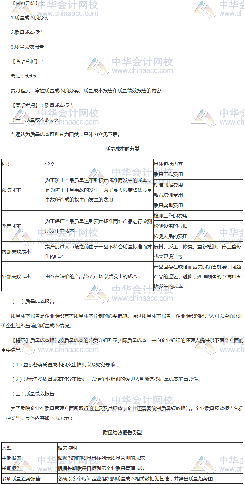 备考时间紧张,抓紧时间抓住重点备考注册会计师吧!正保会计网校教学老师为广大考生整理了高频考点,我们一起来学习2018年《财务成本管理》高频考点:质量成本报告。本考点属于《财务成本管理》第二十一章管理会计报告第二节质量成本报告的内容。
