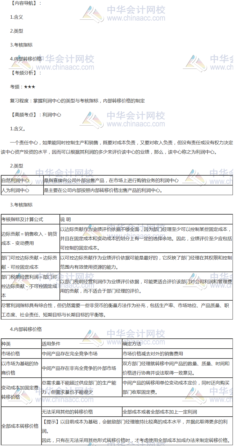备考时间紧张,抓紧时间抓住重点备考注册会计师吧!正保会计网校教学老师为广大考生整理了高频考点, 我们一起来学习2018年《财务成本管理》高频考点:利润中心。本考点属于《财务成本管理》第十九章责任会计第三节利润中心的内容。