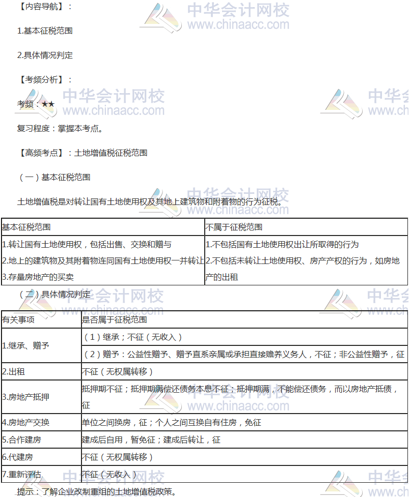 备考时间紧张,抓紧时间抓住重点备考注册会计师吧!正保会计网校教学老师为广大考生整理了高频考点,我们一起来学习2018《税法》高频考点:土地增值税征税范围。本考点属于《税法》第十章房产税法、契税法和土地增值税法第三节土地增值税纳税义务人与征税范围的内容。
