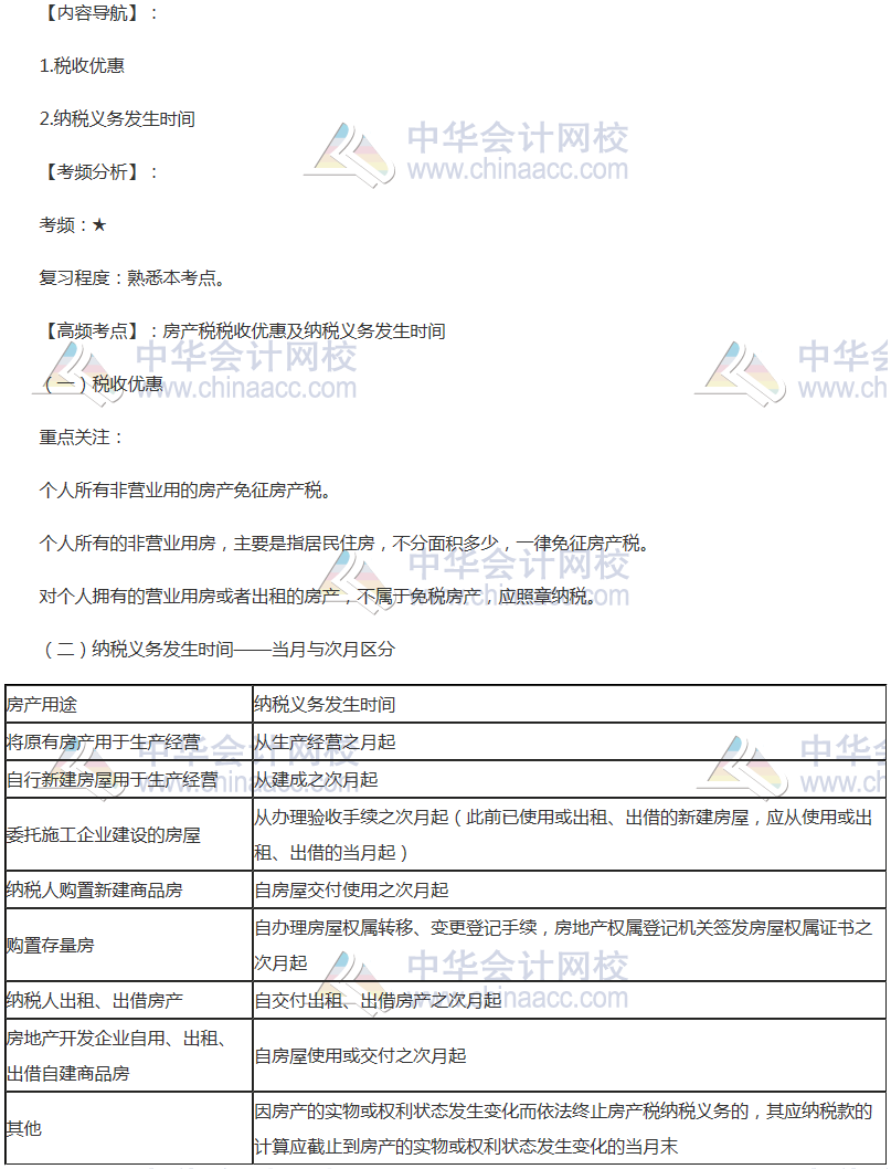 备考时间紧张,抓紧时间抓住重点备考注册会计师吧!正保会计网校教学老师为广大考生整理了高频考点,我们一起来学习2018年《税法》高频考点:房产税税收优惠及纳税义务发生时间。本考点属于《税法》第十章房产税法、契税法和土地增值税法第一节房产税法的内容。