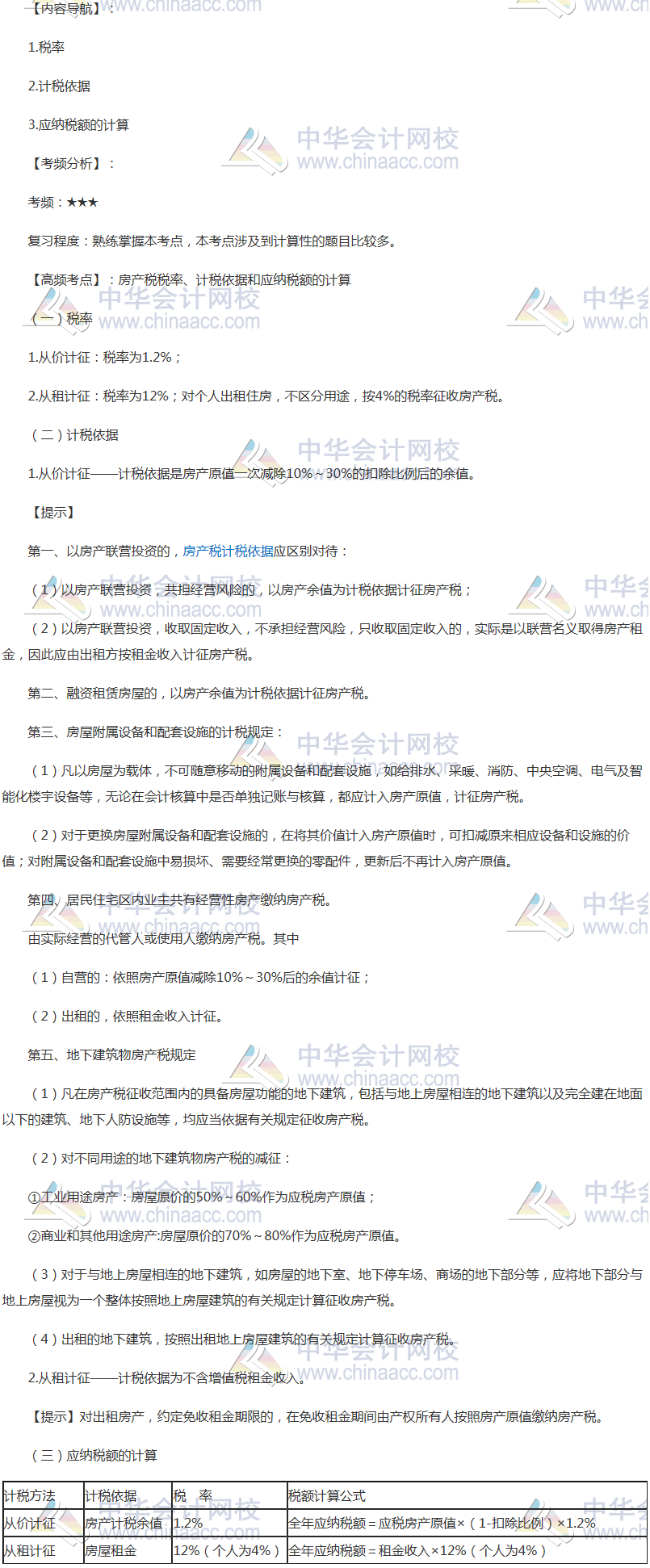 备考时间紧张,抓紧时间抓住重点备考注册会计师吧!正保会计网校教学老师为广大考生整理了高频考点,我们一起来学习2018年《税法》高频考点:房产税税率、计税依据和应纳税额的计算。本考点属于《税法》第十章房产税法、契税法和土地增值税法第一节房产税法的内容。
