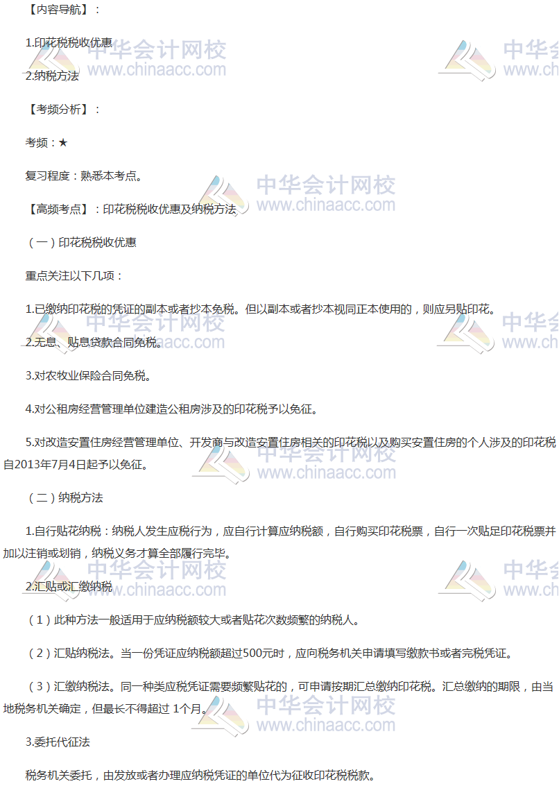 备考时间紧张,抓紧时间抓住重点备考注册会计师吧!正保会计网校教学老师为广大考生整理了高频考点,我们一起来学习2018年《税法》高频考点:印花税税收优惠及纳税方法。本考点属于《税法》第十一章车辆购置税法、车船税法和印花税法第三节印花税法的内容。