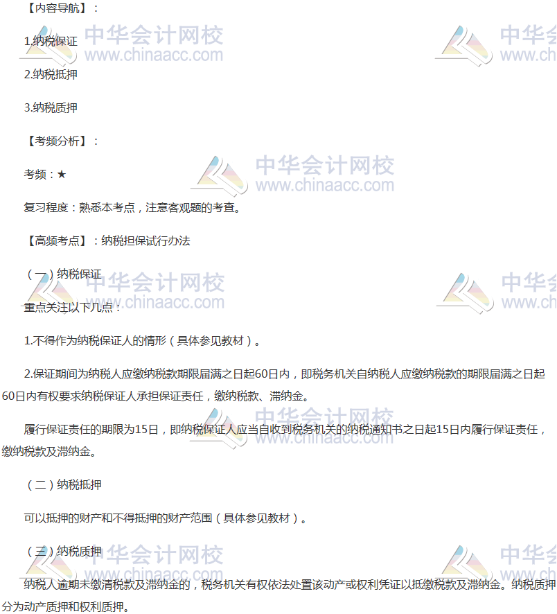 备考时间紧张,抓紧时间抓住重点备考注册会计师吧!正保会计网校教学老师为广大考生整理了高频考点,我们一起来学习2018年《税法》高频考点:纳税担保试行办法。本考点属于《税法》第十三章税收征收管理法第六节纳税担保试行办法的内容。