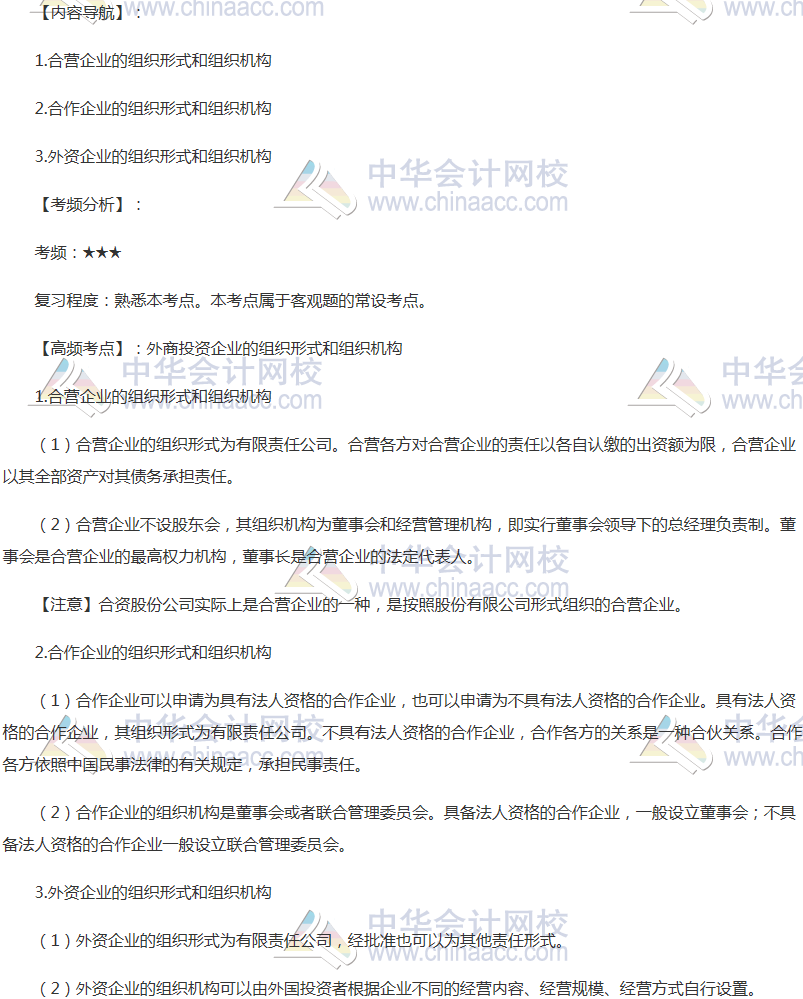 备考时间紧张,抓紧时间抓住重点备考注册会计师吧!正保会计网校教学老师为广大考生整理了高频考点,我们一起来学习2018《经济法》高频考点:外商投资企业的组织形式和组织机构。本考点属于《经济法》第十二章涉外经济法律制度第一节涉外投资法律制度的内容。