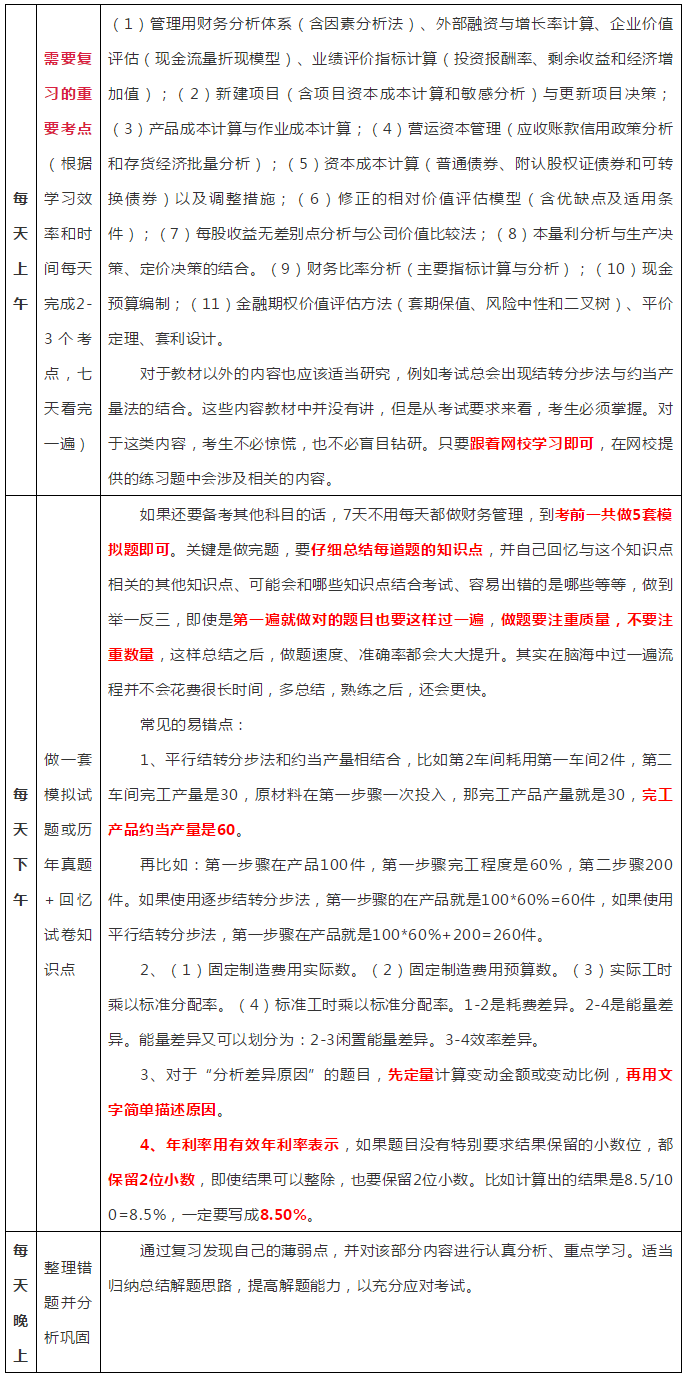 财务管理涉及的计算题目比较多。对于计算型知识点和公式,要注重理解分析,不要以为记住公式就能够顺利备考,要会运用这些公式最快速的方法就是理解教材中的例子,所以假期要全面研读指定的教材或者讲义,把握常用的公式、重要的知识点、章节。