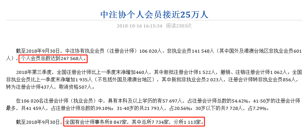 2018年10月16日,中注协公布了个人会员的统计人数,中注协现有个人会员人数接近25万人!
