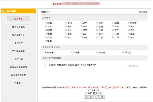 每个省份都有区域选择,是根据住宅所在地来选择区域,以方便中注协将考生分配到离家较近的考场。之后记得把下边的"我已阅读公告"勾上。