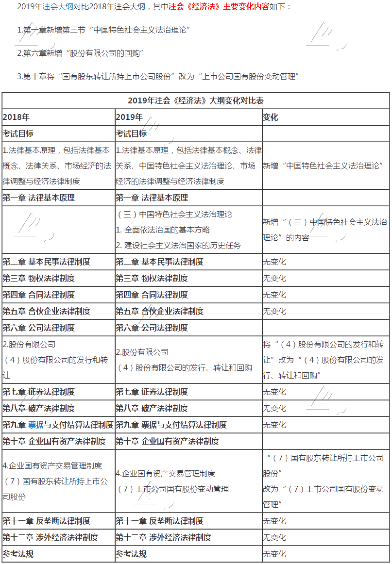 2019年注册会计师考试大纲已出,正保会计网校的各位老师通过解读注册会计师考试大纲,对比2018年注册会计师考试大纲,现将2019年注册会计师《经济法》考试大纲变动情况整理如下。