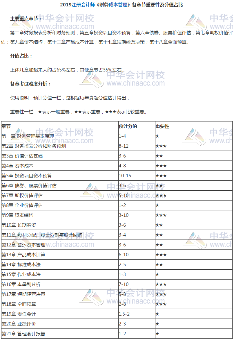 相信了解考试重点再去做题才会更有针对性,为了让网校的众多考生增加更多的信心及坚定的意志,网校特别为大家准备了2019年注册会计师《财管》各章节重要性及分值占比: