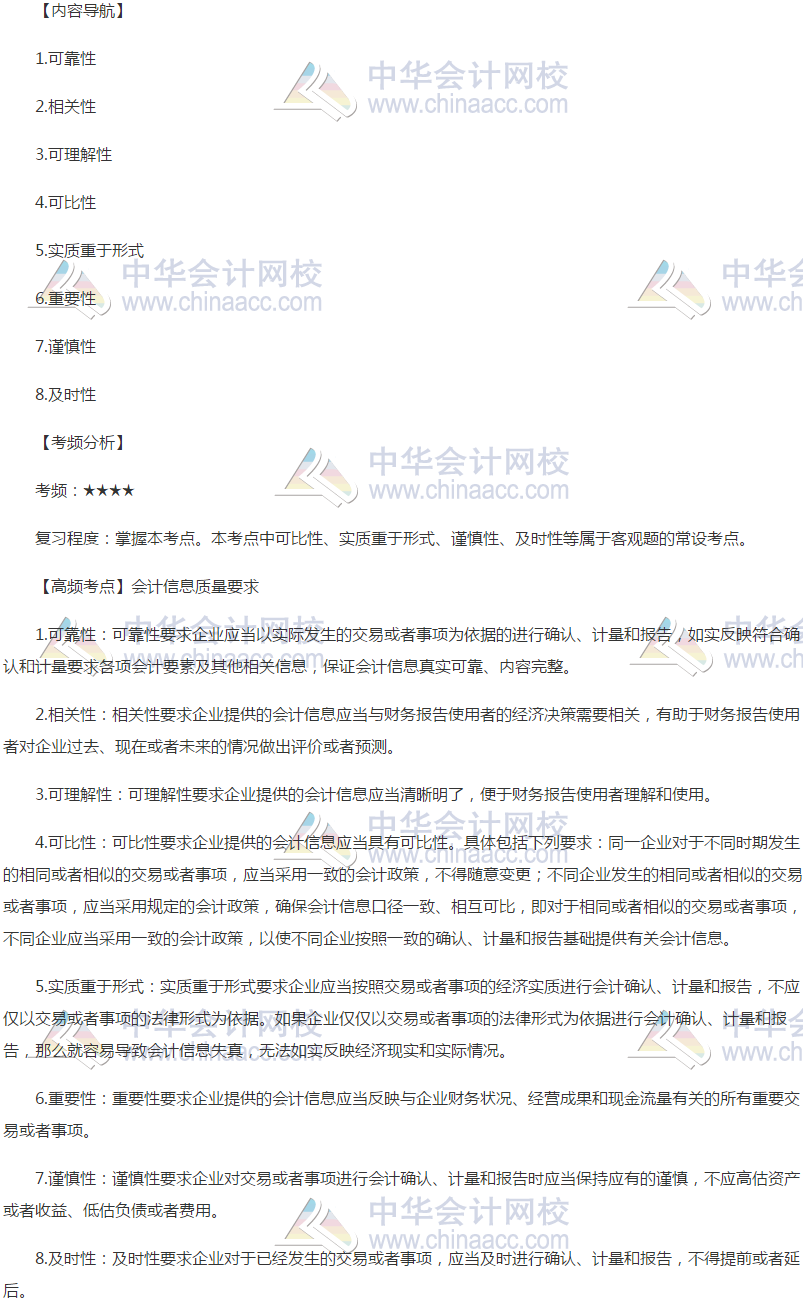 2019年注册会计师备战全面展开,为了能让注会的各位小伙伴在今年的注会备考中步步为营,正保会计网校的各位老师为大家整理了《会计》各章高频考点。现在,我们一起来学习2019《会计》高频考点:会计信息质量要求。本考点属于《会计》第一章总论第三节会计信息质量要求的内容。