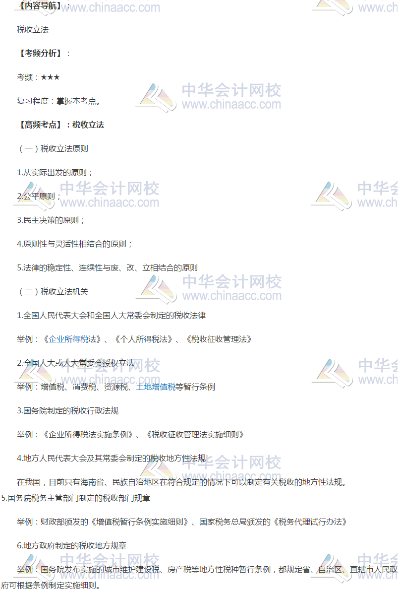 备考时间紧张,抓紧时间抓住重点备考注册会计师吧!正保会计网校教学老师为广大考生整理了高频考点,我们一起来学习2019年《税法》高频考点:税收立法。本考点属于《税法》第一章税法总论第四节税收立法与我国税法体系的内容。