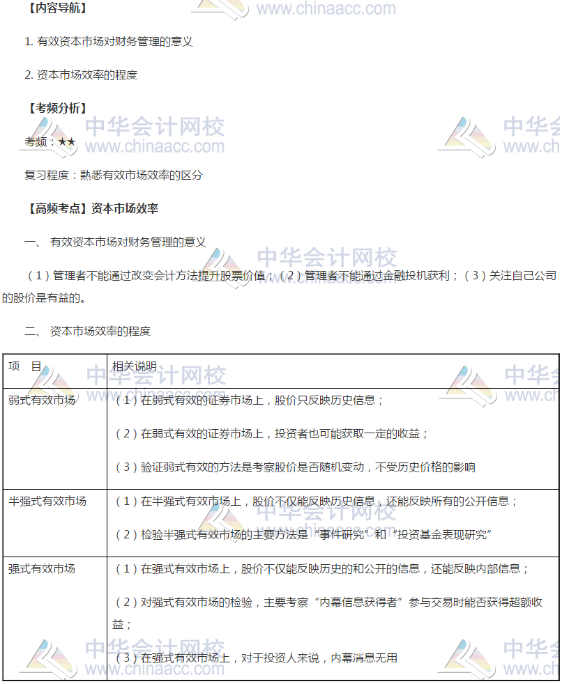 备考时间紧张,抓紧时间抓住重点备考注册会计师吧!正保会计网校教学老师为广大考生整理了高频考点,我们一起来学习2019年《财务成本管理》高频考点:资本市场效率。本考点属于《财务成本管理》第一章财务管理基本原理第四节中金融工具与金融市场的内容。