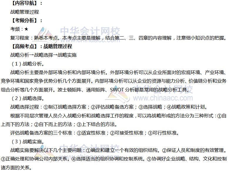 备考时间紧张,抓紧时间抓住重点备考注册会计师吧!正保会计网校教学老师为广大考生整理了高频考点,我们一起来学习2019年《公司战略与风险管理》高频考点:战略管理过程。本考点属于《公司战略与风险管理》第一章战略与战略管理第二节公司战略管理的内容。
