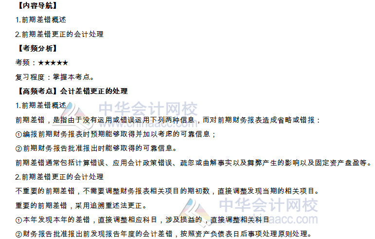 2019年注册会计师备战全面展开,为了能让注会的各位小伙伴在今年的注会备考中步步为营,正保会计网校的各位老师为大家整理了《会计》各章高频考点。现在,我们一起来学习2019《会计》高频考点:会计差错更正的处理。本考点属于《会计》第二章会计政策、会计估计及其变更和差错更正第五节前期差错及其更正的内容。