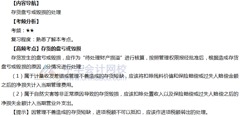 2019年注册会计师备战全面展开,为了能让注会的各位小伙伴在今年的注会备考中步步为营,正保会计网校的各位老师为大家整理了《会计》各章高频考点。现在,我们一起来学习2019《会计》高频考点:存货的盘亏或毁损。本考点属于《会计》第三章存货第四节存货的清查盘点的内容。