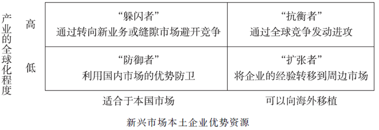 新兴市场是指一些市场发展潜力巨大的发展中国家。此处重点讲解在全球化竞争中,新兴市场中本土企业的战略选择。
