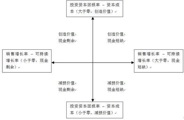 (投资资本回报率-资本成本)大于0 (销售增长率-可持续增长率)小于0 |