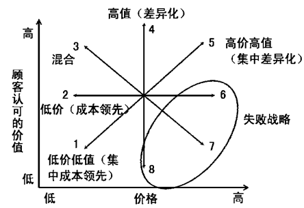 成本领先战略包括途径1和途径2。差异化战略包括途径4和途径5.混合战略指途径3.途径6、途径7、途径8一般情况下可能是导致企业失败的战略。