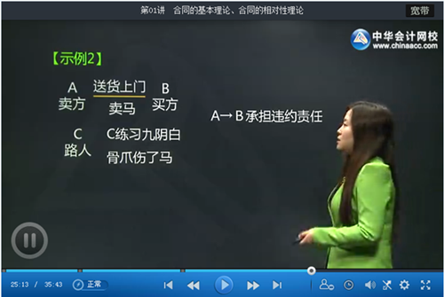苏苏老师授课中理论联系实际,使学员的学习更加轻松和深入。经常用生活中的例子来讲解枯燥的法律条文,使原本枯燥的经济法变得妙不可言。苏苏老师说:要约与承诺可以这样来举例。去菜市场买菜,见一小贩在那儿吆喝:“东北大青菜,5元一斤嘞”。这时候买菜大妈说:“给我来两斤。”这里面小贩的吆喝就是要约,而买菜大妈的回应就是承诺。合同这时候就成立了。