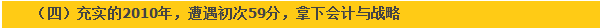 关于2010年CPA,考试一周后我曾在网校写了征文“不抛弃,不放弃”。那年,我继续认为审计与财管没有问题,会计够悬,改革后新增的公司战略与风险管理准备不怎么样考前差点不想去。结果跟我开了个大玩笑:审计原地踏步,财管59!倒是两门没把握的反而过了!财管查分仍未过,伤心了一段时间,擦干眼泪,再次听“从头再来”、“心若在,梦就在”等歌后,继续前行。再怎么着,今年还是有收获的,离自己的目标又前进了一大步:会计超过70分!而且论考试科目,已经过半了,胜利就在前方,而且剩下的两门课,财管与审计都是五十多分。
