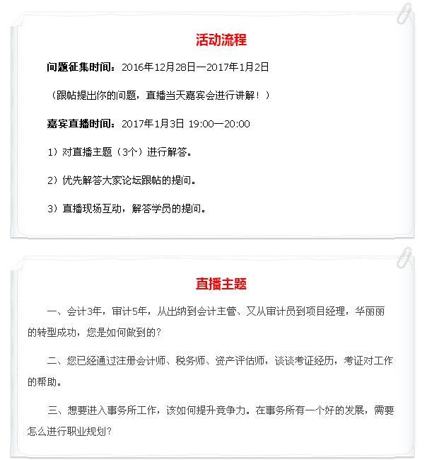 本期嘉宾是北京某会计师事务所的项目经理,她从事会计工作3年,事务所工作5年,从出纳到会计主管、又从审计员到项目经理,她是如何做到转行成功的?她是如何坚守着心中的信念,勇敢前行的?对于提升核心竞争力、成功面试进入事务所工作,她有哪些建议?为此,特邀请嘉宾采用视频直播的形式跟大家互动,敬请期待!
