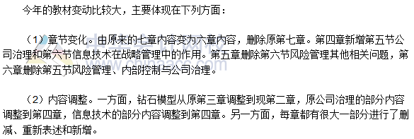 2017年注册会计师考试大纲已经公布,为了更有针对性的进行2017年的注会备考,为帮助广大考生尽快熟悉及了解新教材内容调整变动情况,正保会计网校分别对注会考试各科目作了详细对比。以下是《公司战略与风险管理》教材整体变化情况概述。