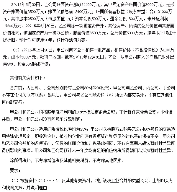 (2)购买日:2×15年6月30日。理由:2×15年6月30日,甲公司以3:1的比例向丙公司发行6000万股普通股,取得乙公司80%股权,有关股份登记和股东变更手续当日完成;同日,甲公司、乙公司的董事会进行了改选。实质上购买方取得对被购买方的控制权。