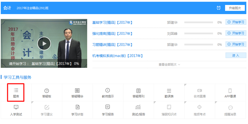 已经购课的网校学员登录“我的网校我的家”在所报科目下即可看到题库入口,小编已经给大家标红了。