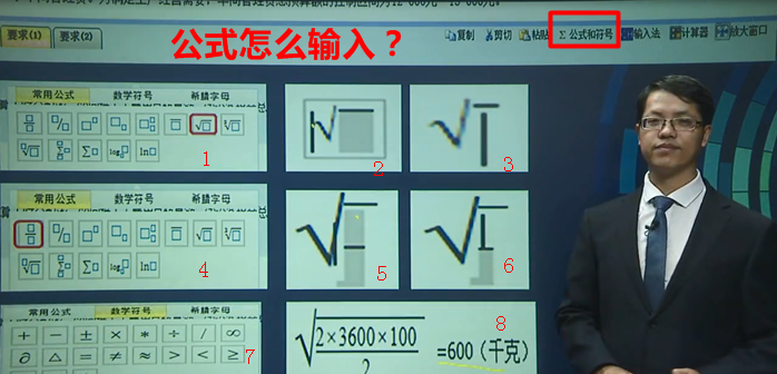 听说公式输入很难,应该怎么输入公式呀?点击机考界面的公式与符号按钮就会弹出1,然后按照1~7的顺序进行操作,就能成功的出现8的效果。不信你可以自己试试~