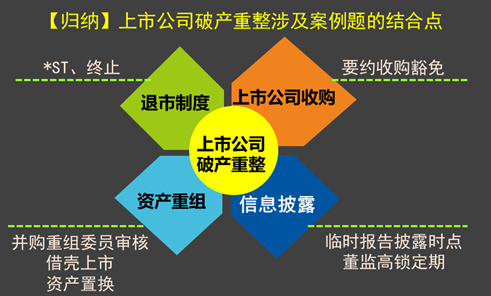 (3)破产重整和证券法中公司重大资产重组也有一定的关联,当上市公司进入破产重整程序时,它会遵循上市公司重大资产重组的一些手段来运作,而重大资产重组不一定要通过破产重整来进行。我们前面讲过,还记得吗?上市公司重大资产重组也可以自己主动玩。而通过破产重整的方式来进行重组,有一个很大的优势,就是能通过“司法权力”强制解决“钉子户”的问题,在上市公司自行重组的过程中,总会有一些“冥顽不化”的股东在决议中投反对票,此时很容易就陷入“僵局”,而破产重整中,人民法院会根据情况强制批准“重整计划草案”,直接拔除掉这些“钉子”。