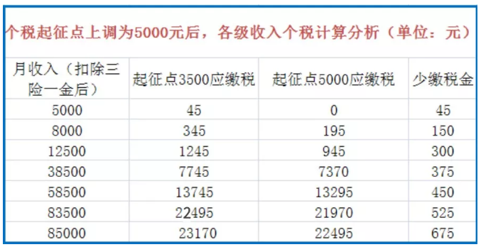假设个税起征点提高到5000元,按现有级距计算,月收入扣除了三险一金后: