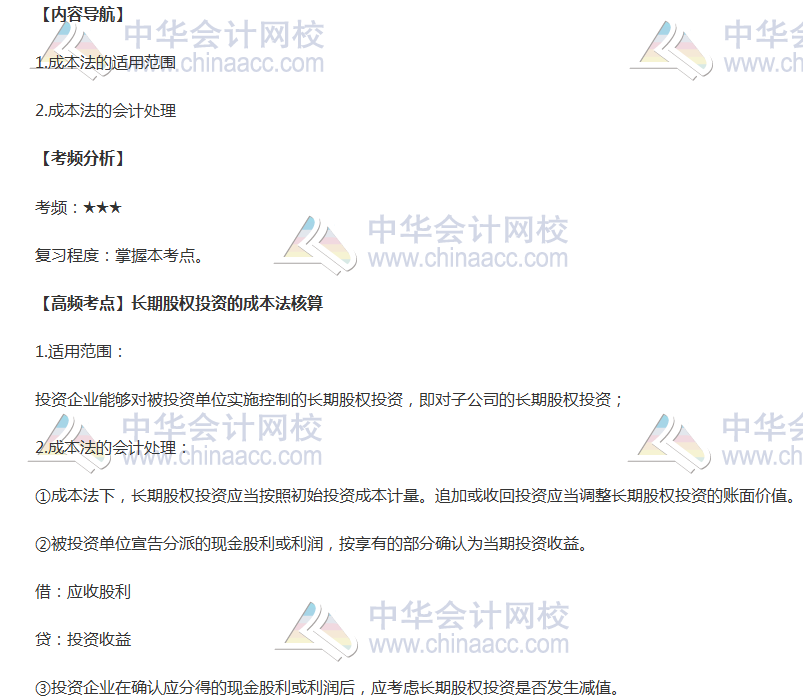 备考时间紧张,抓紧时间抓住重点备考注册会计师吧!正保会计网校教学老师为广大考生整理了高频考点,我们一起来学习2018《会计》高频考点:长期股权投资的成本法核算。本考点属于《会计》第七章长期股权投资与合营安排第三节长期股权投资的后续计量的内容。