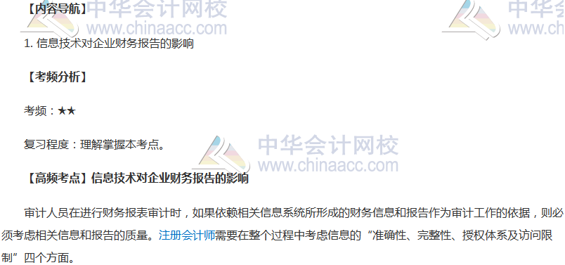 备考时间紧张,抓紧时间抓住重点备考注册会计师吧!正保会计网校教学老师为广大考生整理了高频考点,我们一起来学习2018《审计》高频考点:信息技术对企业财务报告的影响。