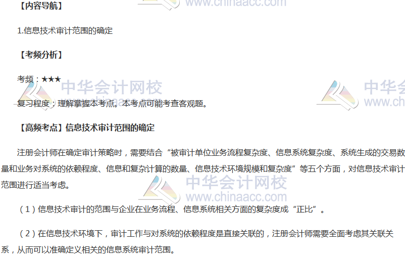 备考时间紧张,抓紧时间抓住重点备考注册会计师吧!正保会计网校教学老师为广大考生整理了高频考点,我们一起来学习2018《审计》高频考点:信息技术审计范围的确定。