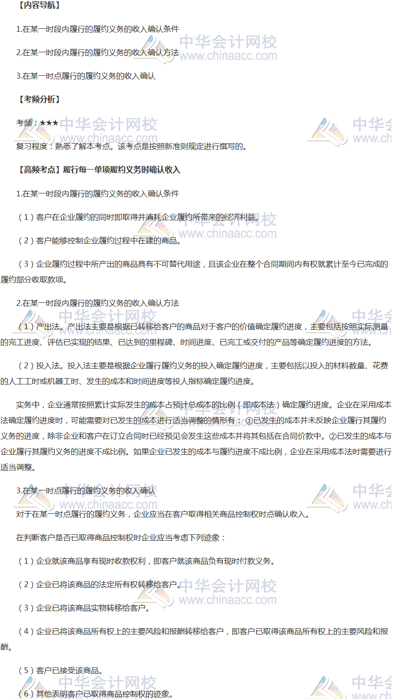 备考时间紧张,抓紧时间抓住重点备考注册会计师吧!正保会计网校教学老师为广大考生整理了高频考点,我们一起来学习2018《会计》高频考点:履行每一单项履约义务时确认收入。本考点属于《会计》第十六章收入、费用和利润第一节收入的内容。