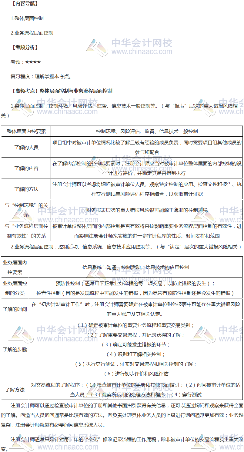 备考时间紧张,抓紧时间抓住重点备考注册会计师吧!正保会计网校教学老师为广大考生整理了高频考点,我们一起来学习2018《审计》高频考点:整体层面控制与业务流程层面控制。