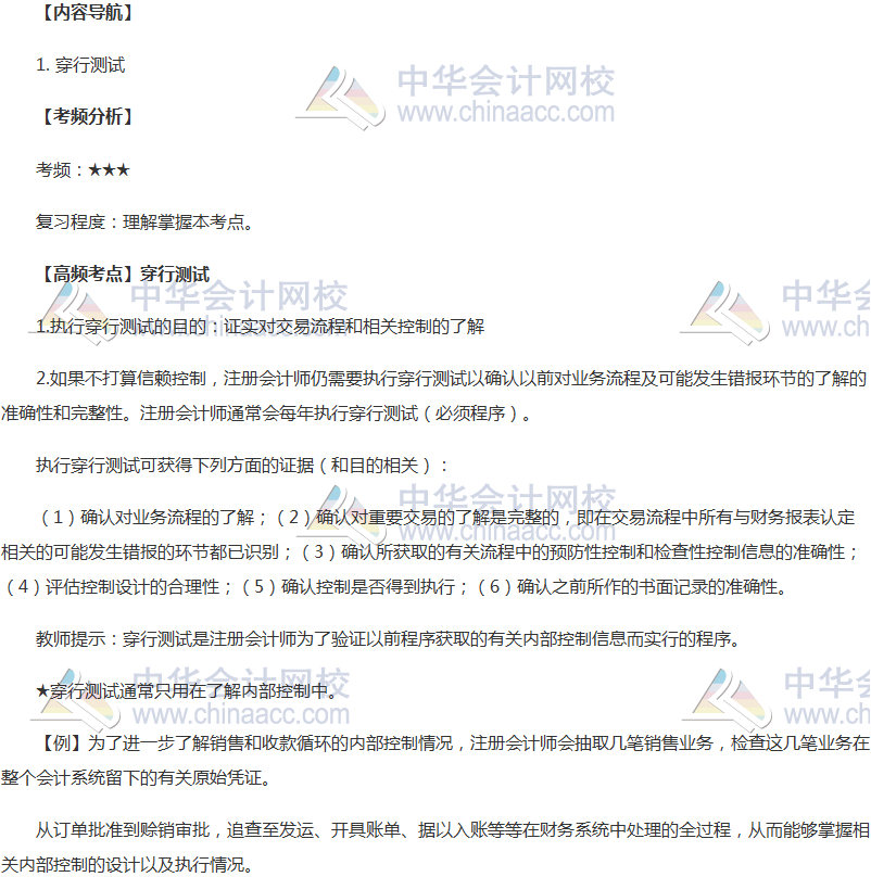 备考时间紧张,抓紧时间抓住重点备考注册会计师吧!正保会计网校教学老师为广大考生整理了高频考点,我们一起来学习2018《审计》高频考点:穿行测试。