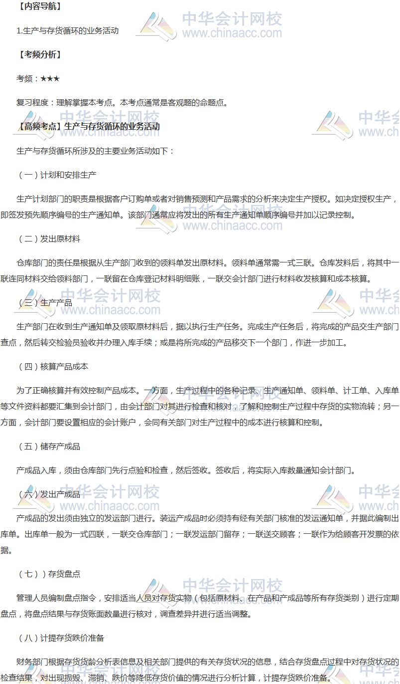 注会备考时间紧张,抓紧时间、抓住重点准备注册会计师考试吧!正保会计网校教学老师为广大考生整理了注册会计师高频考点,我们一起来学习2018《审计》高频考点:生产与存货循环的业务活动。