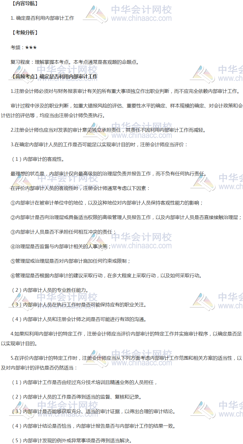 注会备考时间紧张,抓紧时间、抓住重点准备注册会计师考试吧!正保会计网校教学老师为广大考生整理了注册会计师高频考点,我们一起来学习2018《审计》高频考点:确定是否利用内部审计工作。
