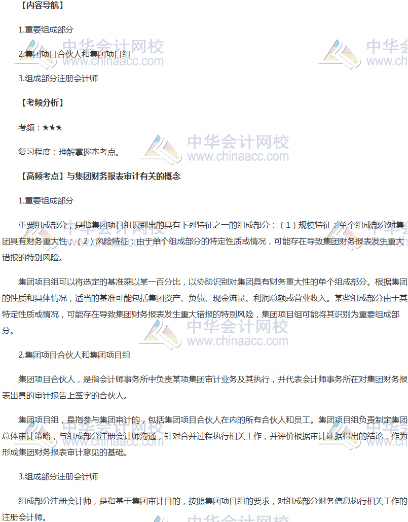 注会备考时间紧张,抓紧时间、抓住重点准备注册会计师考试吧!正保会计网校教学老师为广大考生整理了注册会计师高频考点,我们一起来学习2018《审计》高频考点:与集团财务报表审计有关的概念。