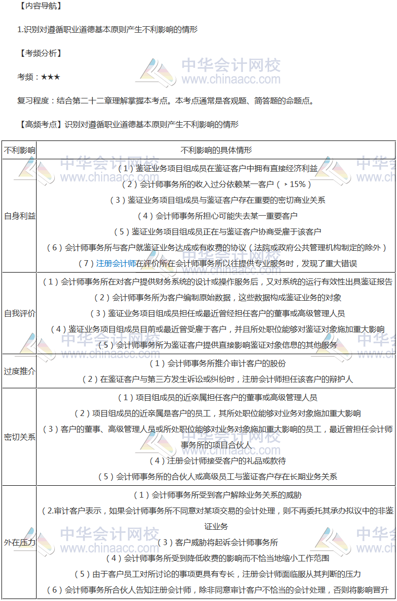 注会备考时间紧张,抓紧时间、抓住重点准备注册会计师考试吧!正保会计网校教学老师为广大考生整理了注册会计师高频考点,我们一起来学习2018《审计》高频考点:识别对遵循职业道德基本原则产生不利影响的情形。