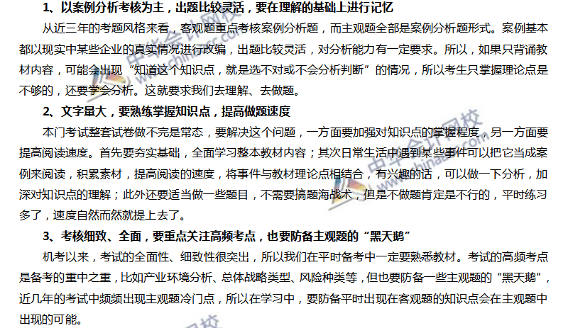 《公司战略与风险管理》科目的教材是六科当中最薄的,章节也是六科当中最少的,也是中注协公布的历年考试通过率相对较高的,因此,很多人都认为这个科目是最简单的。其实不然,这个科目也不是简简单单背诵一下就可以考过的,也有一些考生是考了两三年才通过的。下面就从《公司战略与风险管理》科目的特点及学习建议方面给大家介绍一下。