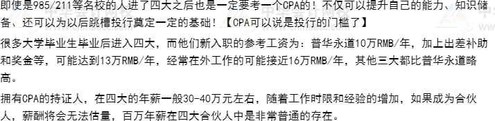 最近总有财会从业人员或者毕业院校并不出众的考生咨询关于:普通院校是否有能力或者能够进入财会人的工作高府——四大?也是比较心酸的回忆和对比。对于本身并不优秀的自己和本就非常优秀却更加努力的同龄人来说,职场中的确不占据优势,那么作为将财会行业当作事业来”经营“的职场人或者在校生,你们还不知道关于注册会计师证书的这几大优势嘛?