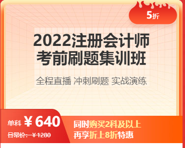 活动期间购买注会考前刷题集训班即可享5折优惠 ,同时购买2科及以上再享折上8折特惠!