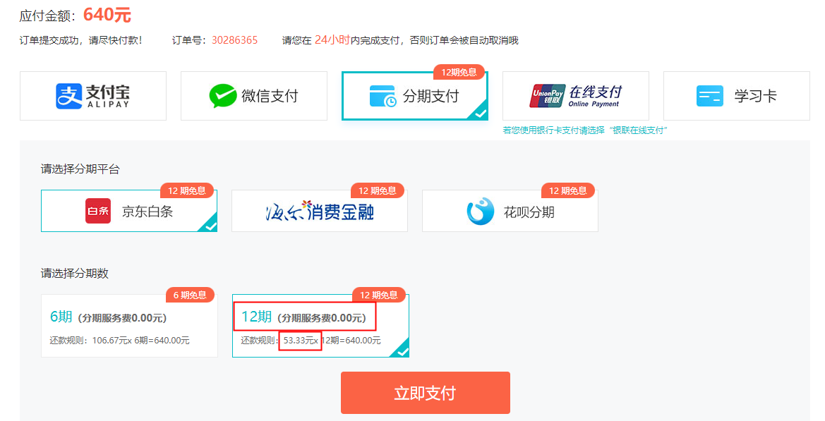 活动期间购买课程,至高享12期免息活动,单科每期仅需53.33元,最高可省千元。
