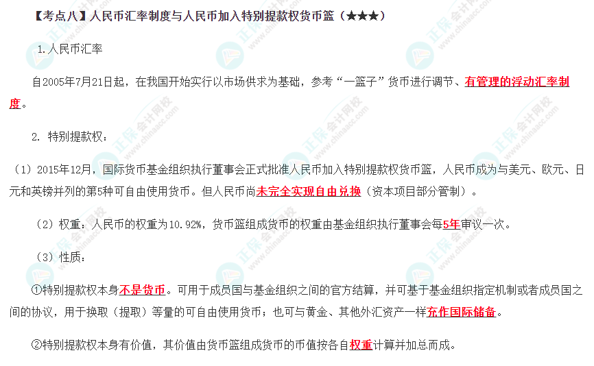 2022年注会《经济法》第十二章高频考点8:人民币汇率制度与人民币加入特别提款权货币篮