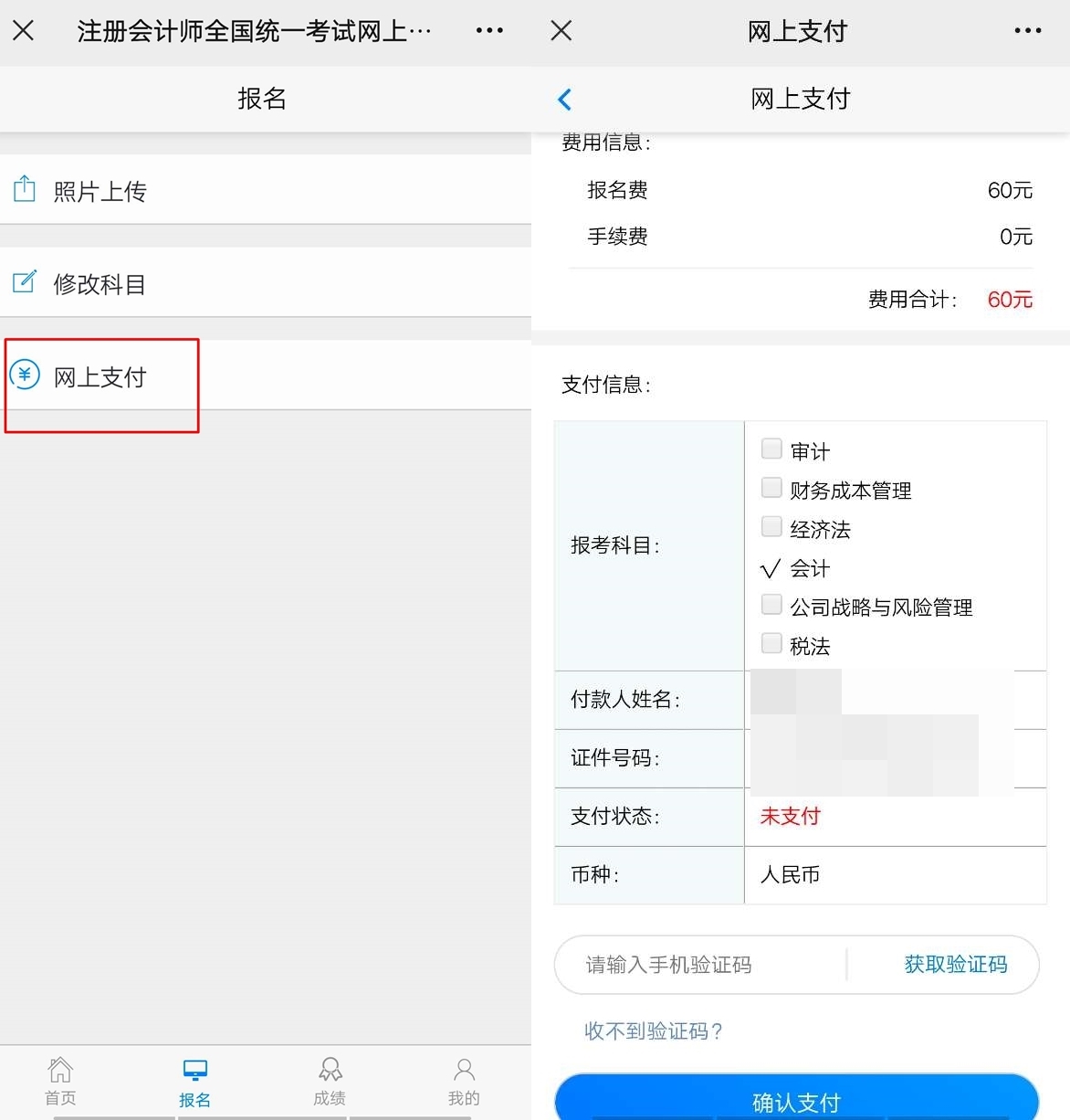 2、修改科目保存后点击网上支付,这个时候报考科目会直接勾选修改后的科目,然后获取手机短信验证码,点击确认支付